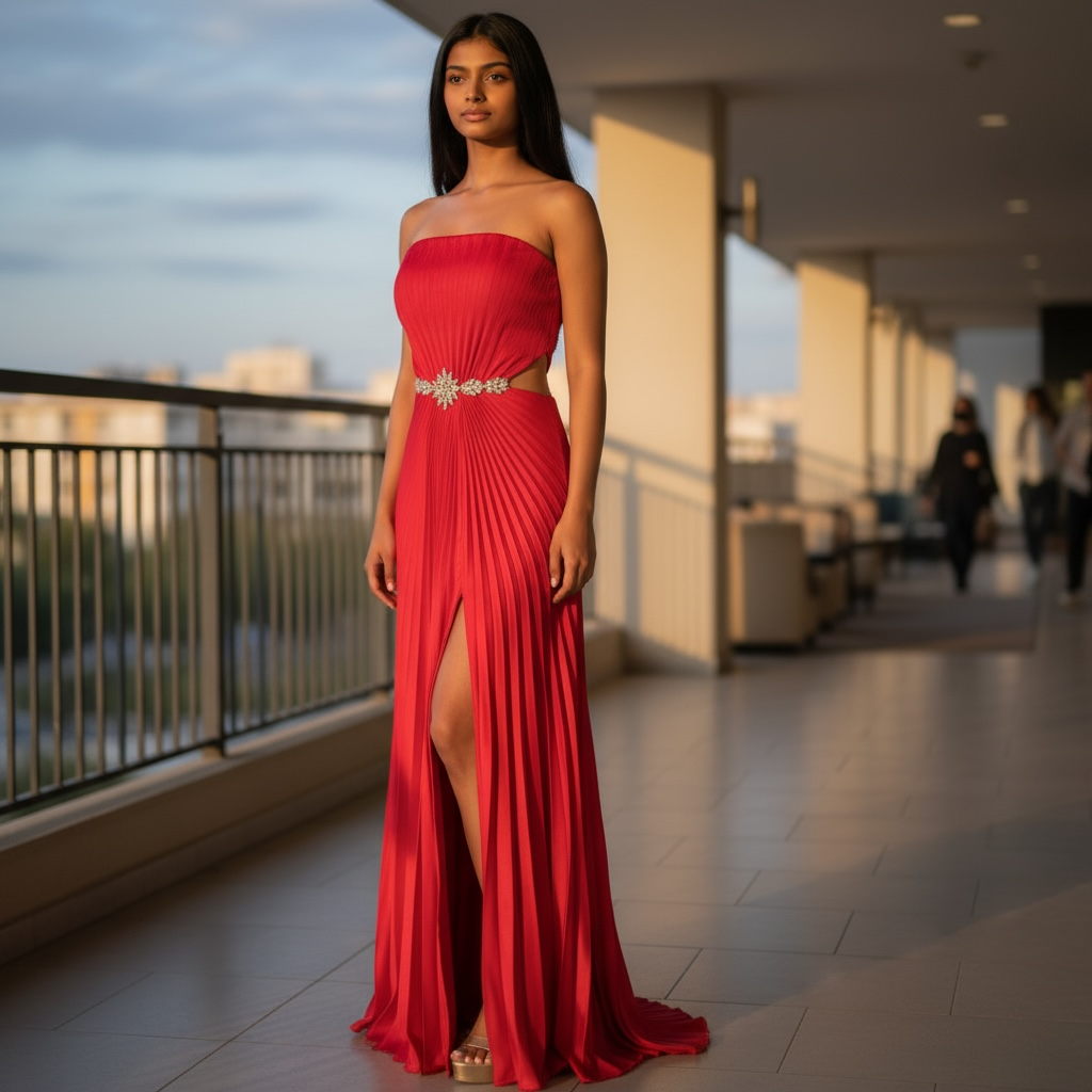 Un abito dalla linea molto particolare interamente in raso satin plissé. Particolari i fianchi lasciati scoperti dal taglio cutout e il centrale in strass preziosissimo! Perfetta la vestibilità grazie ad un corpino strutturato con coppetta interna.