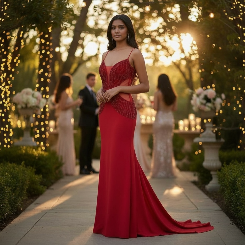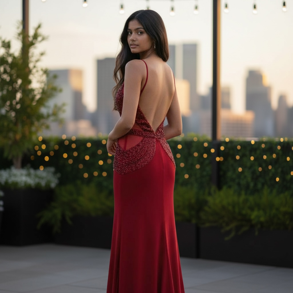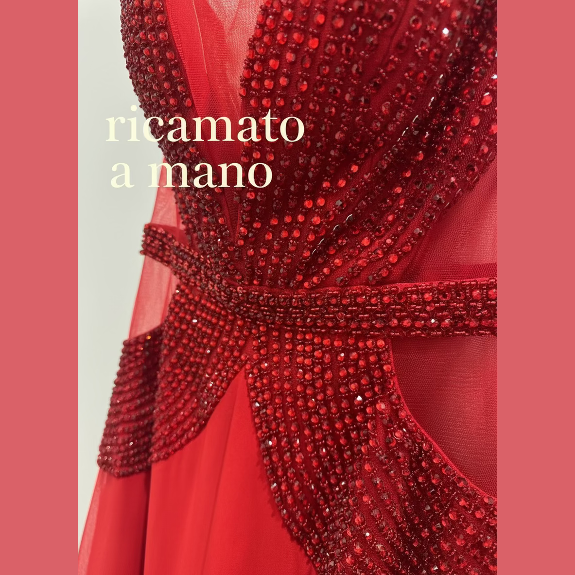 L'elegante abito AISHA con scollatura seducente è una vera opera d'arte, con ricami di strass e perline cuciti a mano per creare un disegno trasparente e audace sul corpino e corpetto. Un capo unico per rimanere impressi nella memoria.