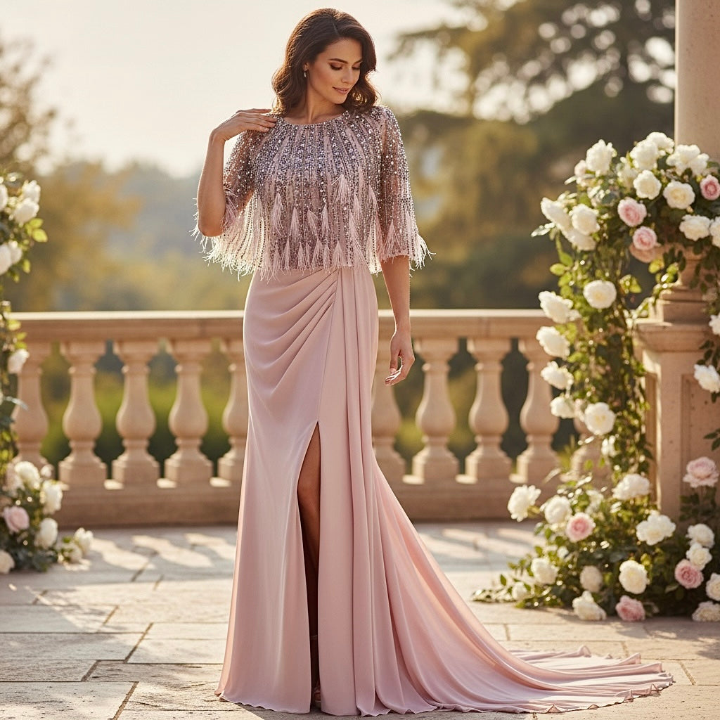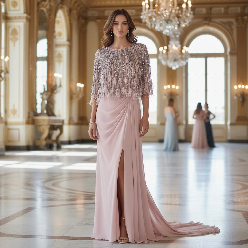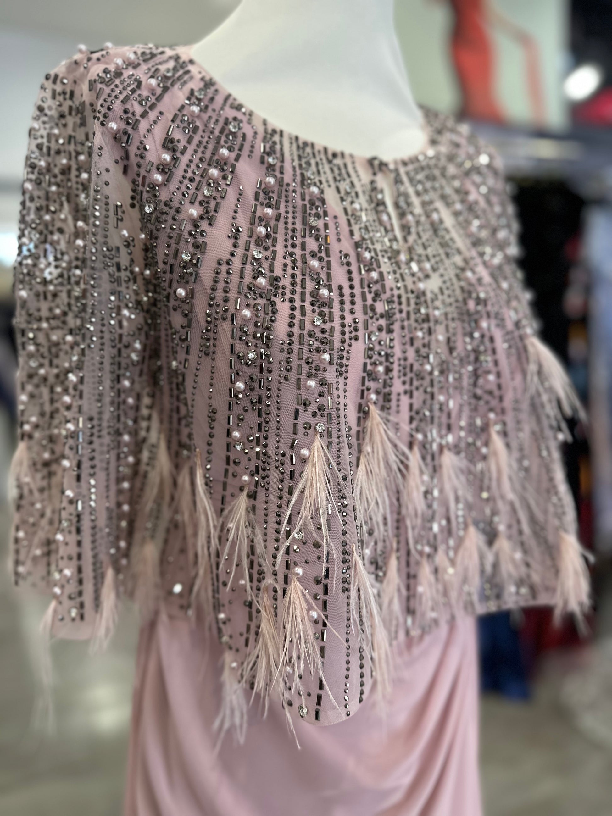 L’abito Angelina è un elegante abito a sirena in chiffon leggero con drappeggio laterale e sopragonna ampia con coda. Il tutto completato da un preziosissimo bolerino a campana in tulle interamente impreziosito da piume e strass argento. Un abito unico nel suo genere perfetto per ruoli importanti. Anche per le seconde nozze o per la sposa che desidera un alternativa al classico abito bianco.