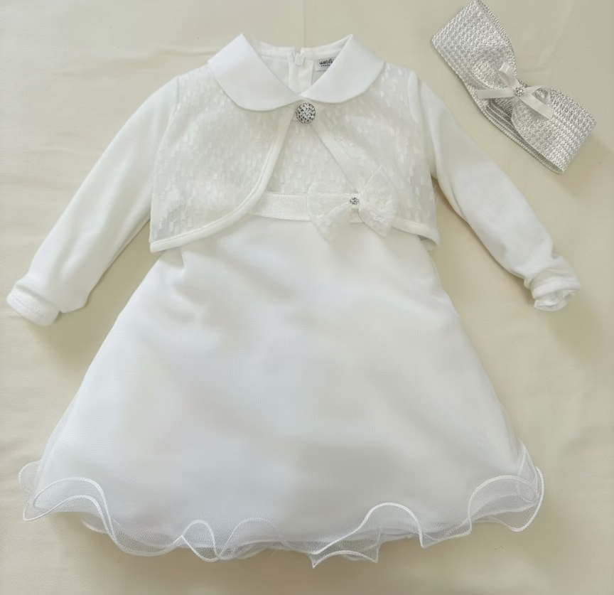 Completo elegante e versatile per la tua bambina. Include un abito scamiciato in tulle con cinta in raso e un fiocco sulla vita, una camicietta in cotone e un giacchino con manica in cotone più fascia. Ideale per ogni stagione, adattabile per creare il look perfetto per il battesimo.