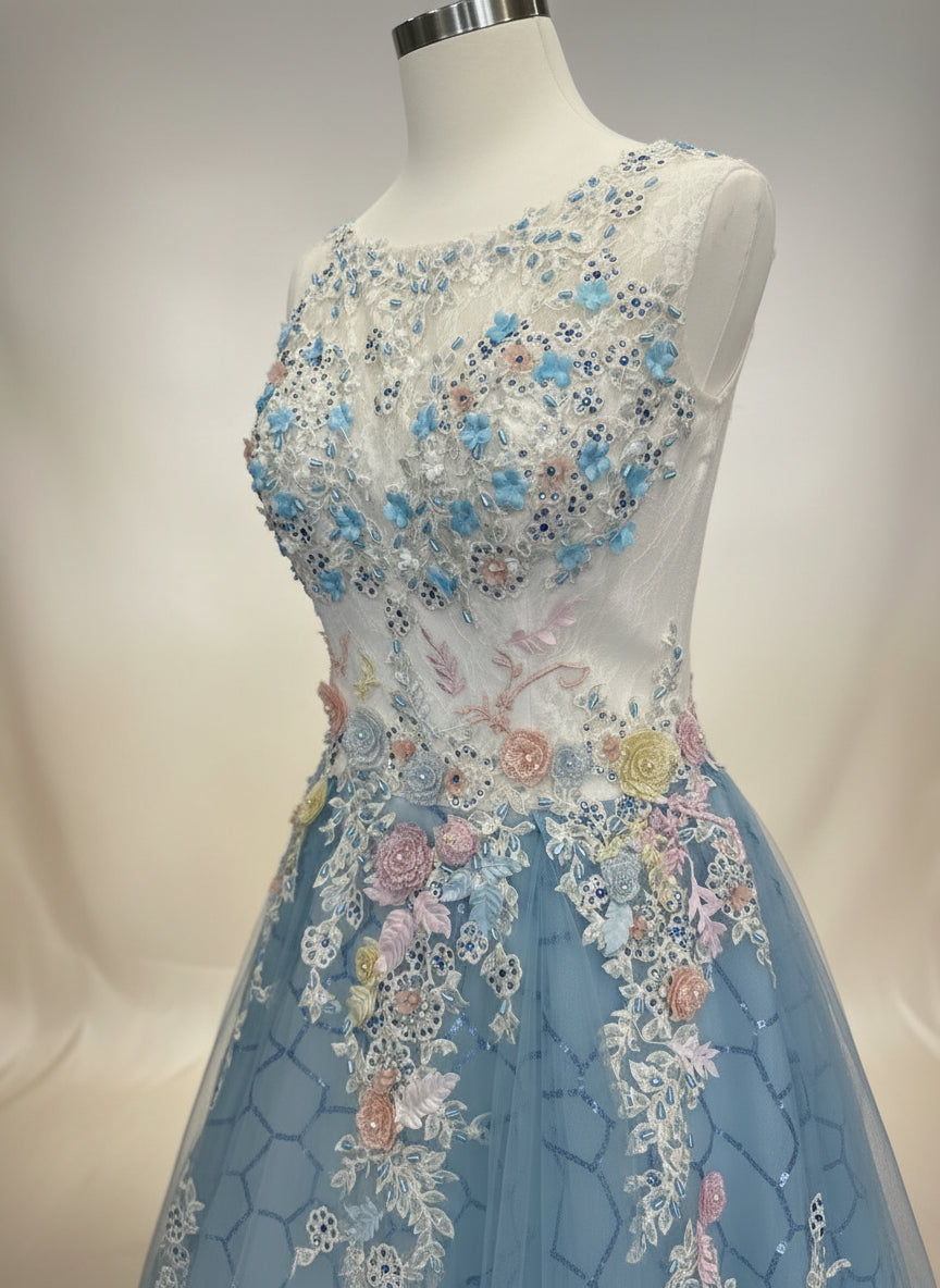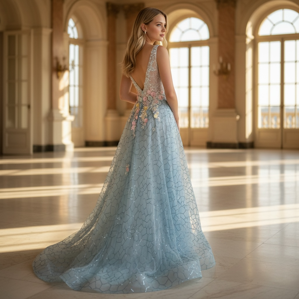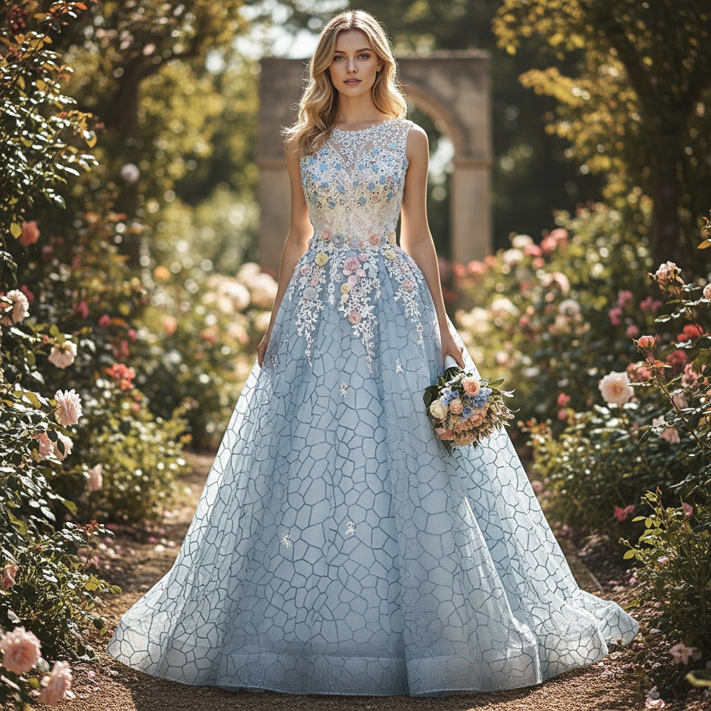 L'abito CELESTE è un gioiello di preziosi ricami, con una gonna ampia in tulle con paillettes a strati alternati. Il corpino è adornato da un intreccio di pizzo e macramè, impreziosito da fiorellini dai vivaci colori e perline ricamate uno ad uno per un effetto tridimensionale. La scollatura a V sul retro e la lunga coda rendono questo abito perfetto per un'occasione speciale o per una sposa non tradizionale.