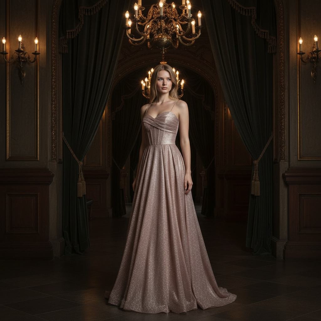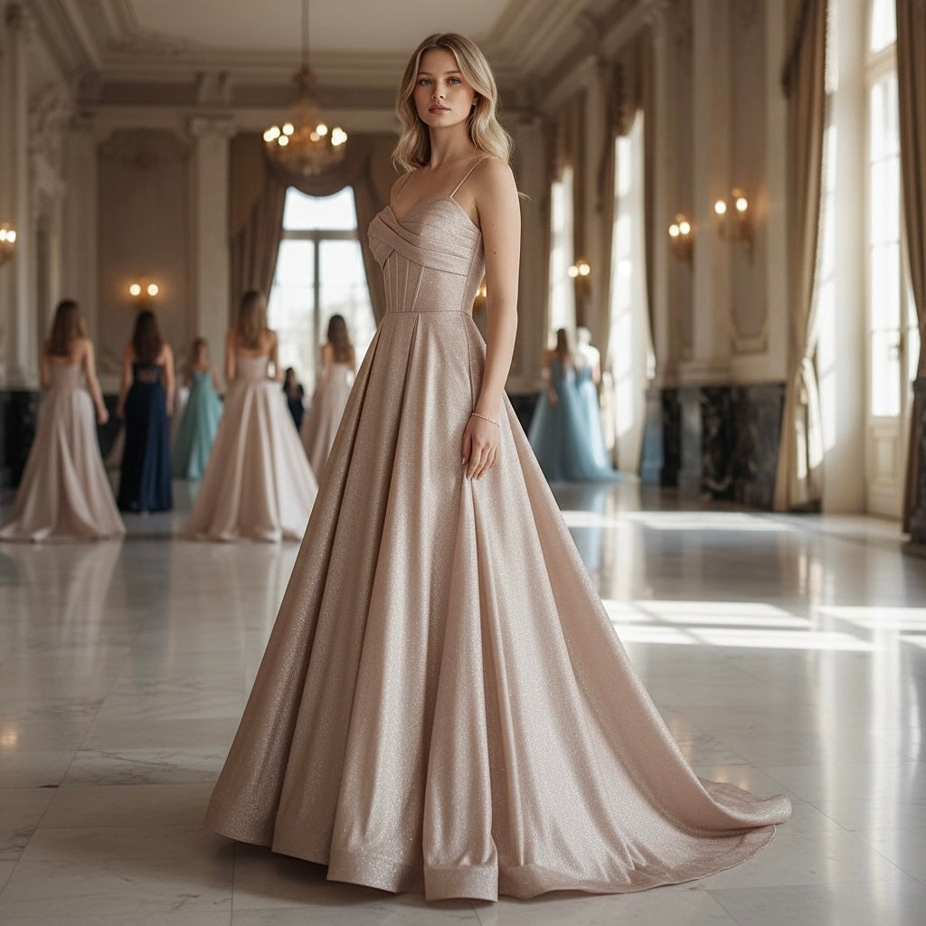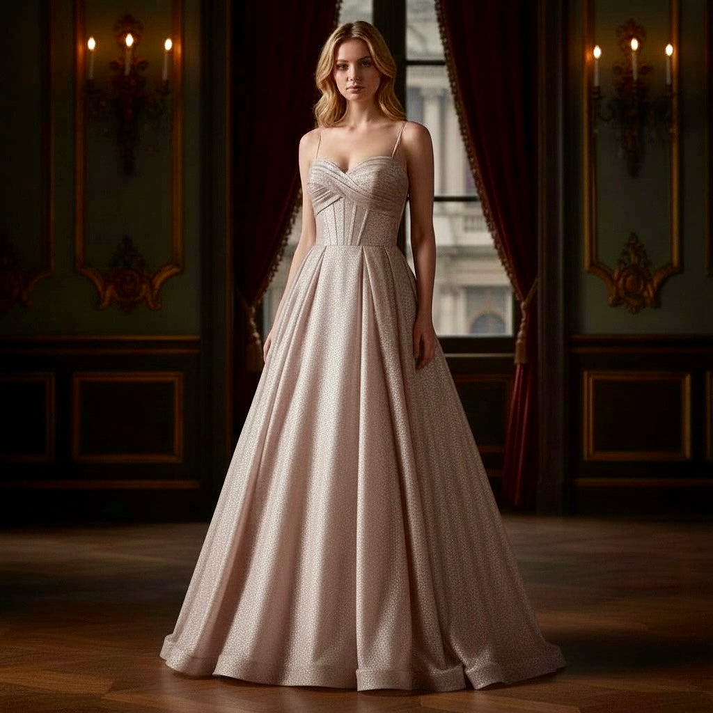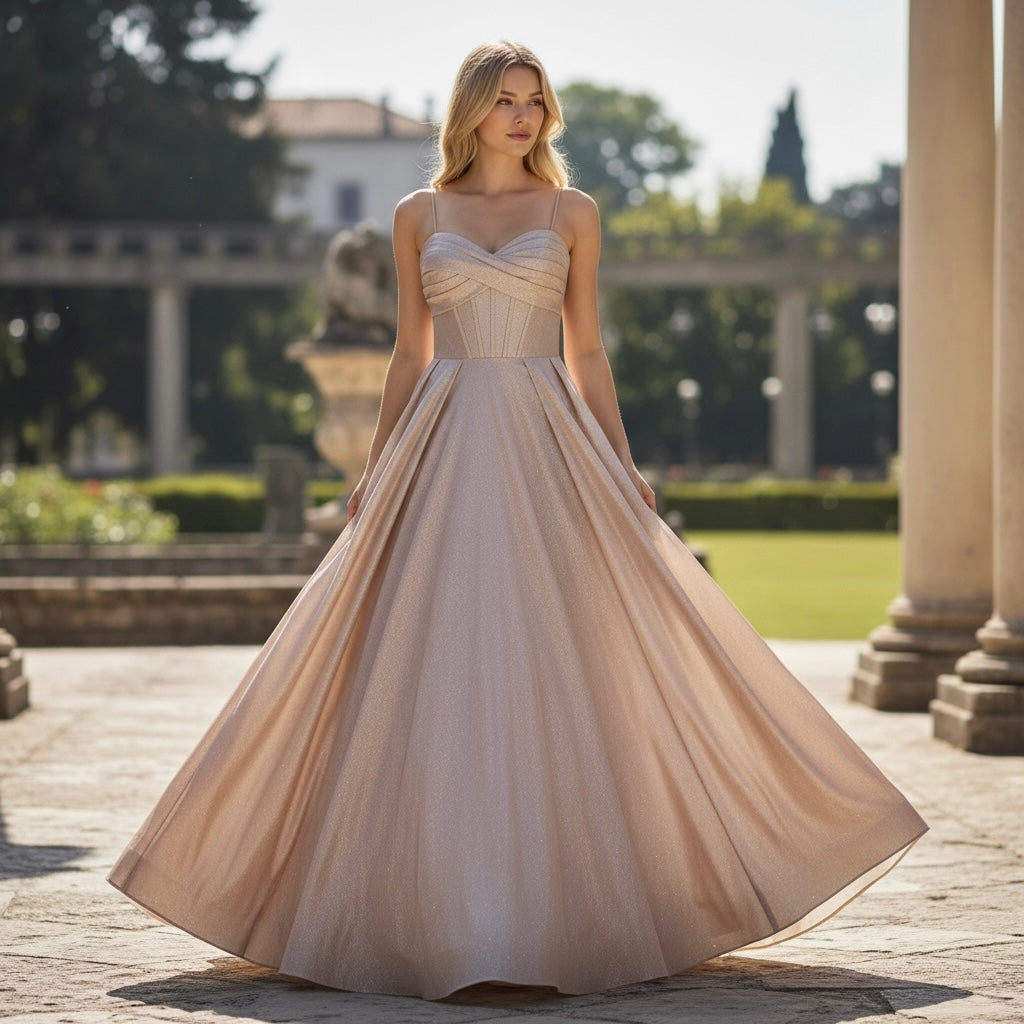 L'Abito EMMA è un elegante vestito da cerimonia con gonna ampia in tessuto glitterato colore champagne. Il corpino steccato evidenzia il punto vita, mentre lo scollo a cuore mette in risalto le spalle. Ideale per eventi speciali, offre un aspetto raffinato e sofisticato.