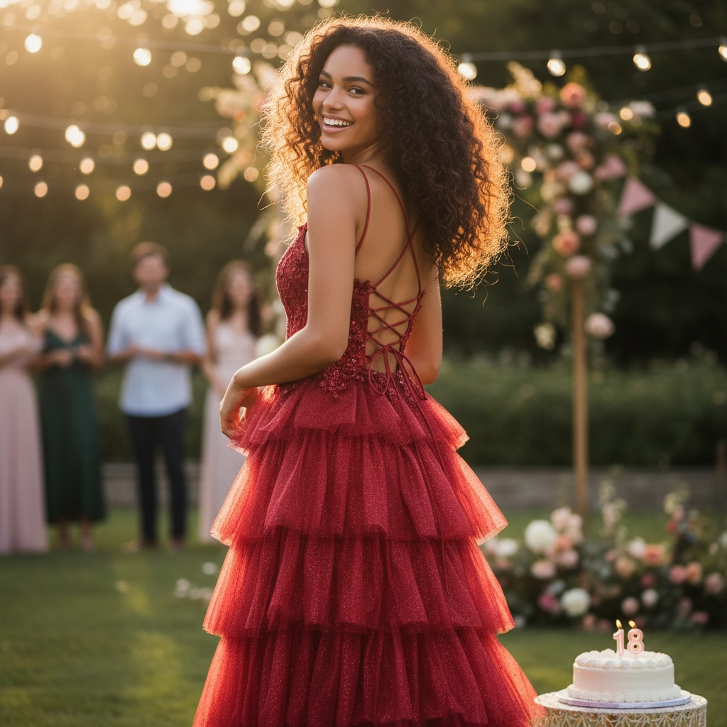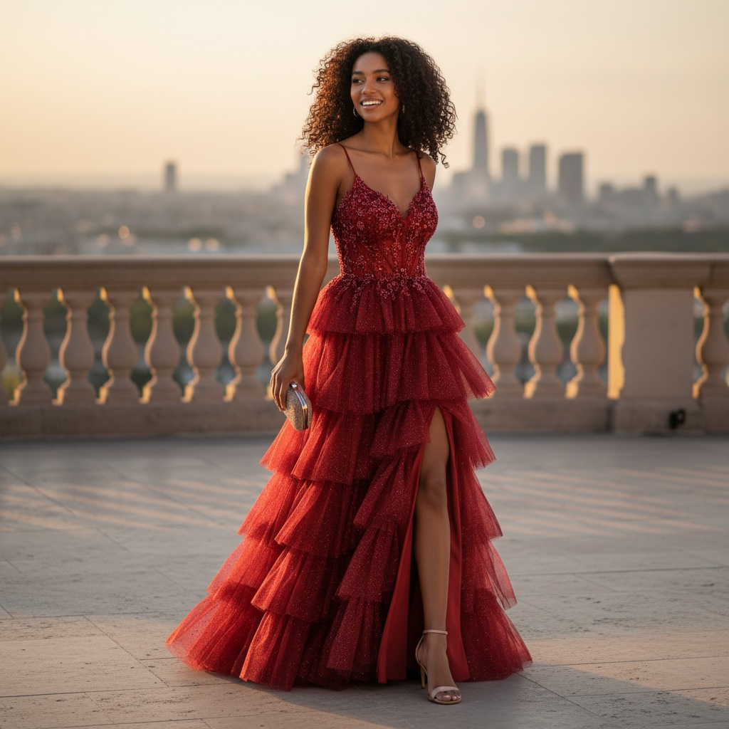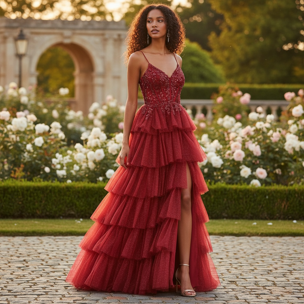 L'abito ESTER è un'elegante creazione che unisce raffinatezza leggerezza e sensualità. Il corpino steccato a guepiere è impreziosito da ricami in macramé e perline, mentre la gonna a balze glitterata dona luminosità al look. Lo spacco e la stringa regolabile sul retro conferiscono un tocco di seduzione. Adatto per occasioni speciali come cerimonie o il tuo diciottesimo compleanno.
