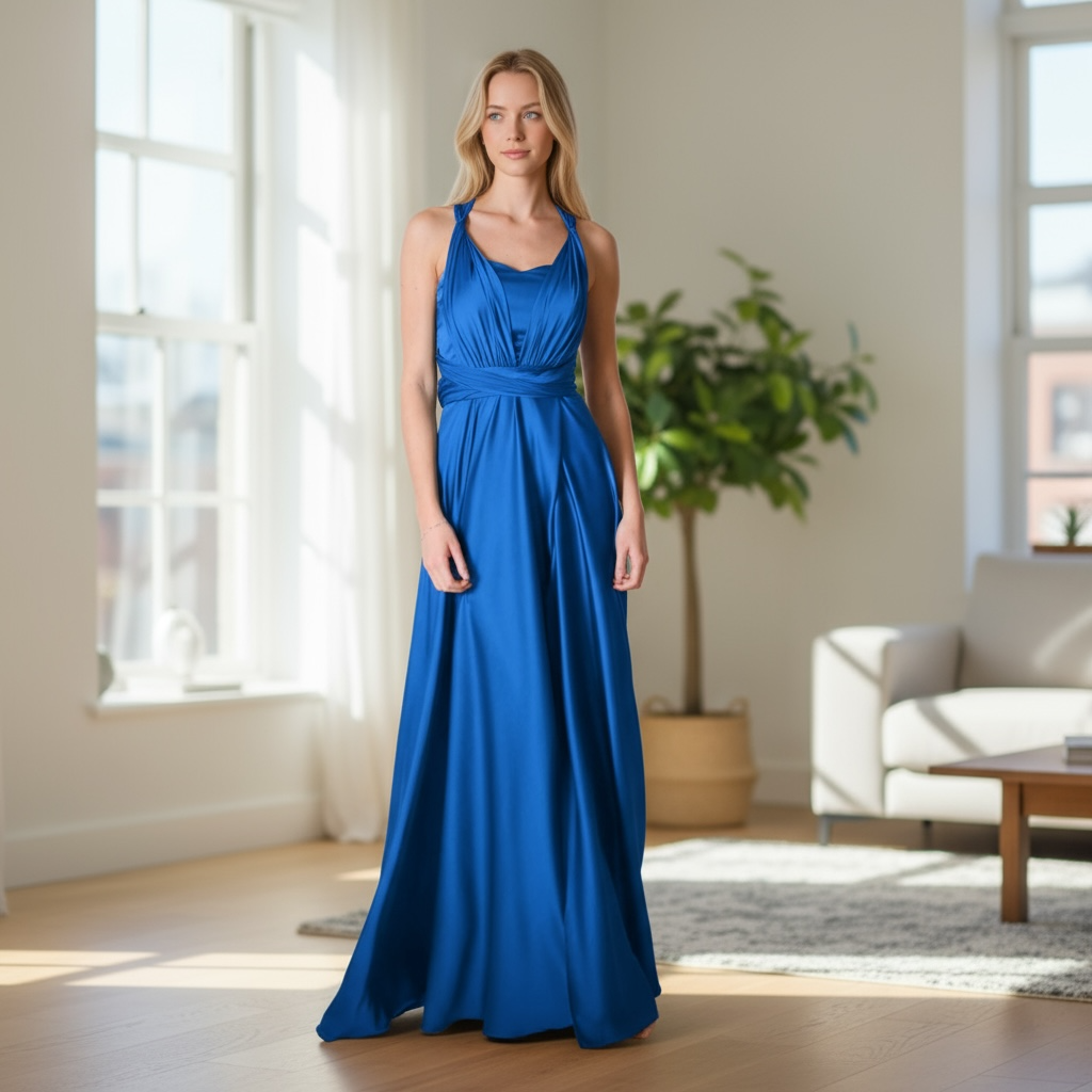 ORDINABILE! Abito in raso leggero con spacco laterale. Il corpino è a cuore e strutturato ed offre un ottima vestibilità. È munito di due lunghe fusciacche che permettono di realizzare diversi modelli di scollatura! Chiusura lampo sul retro a scomparsa. Coppa inclusa.