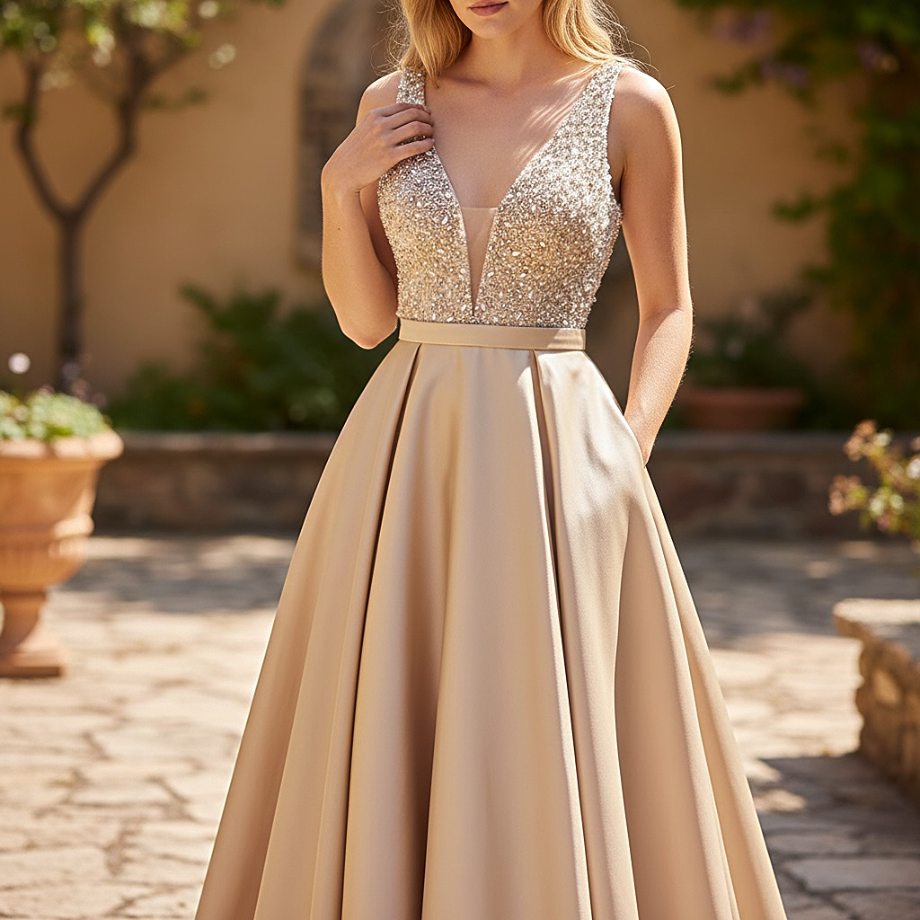 L'abito IVONNE è caratterizzato da un gonnellone ampio in mikado, che offre comfort e funzionalità grazie alle tasche integrate. La vita alta accentuata dalla cintina e il corpino con scollo a V ricamato di perline e paillettes conferiscono un'eleganza sofisticata, ideale per occasioni formali come matrimoni.