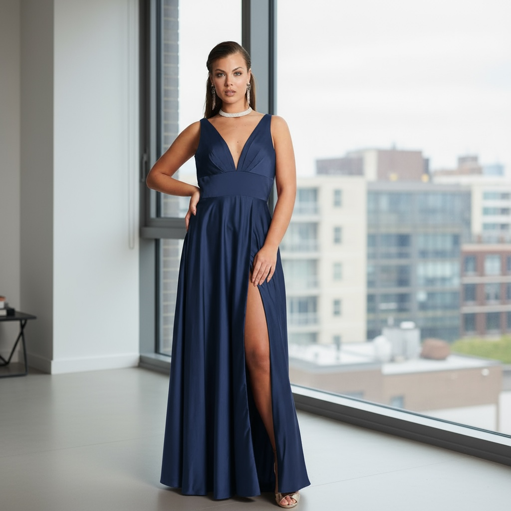 Abito in rasone pesante con taglio a vita alta e scollo a V profondo. Spacco sul lato e chiusura sul retro.