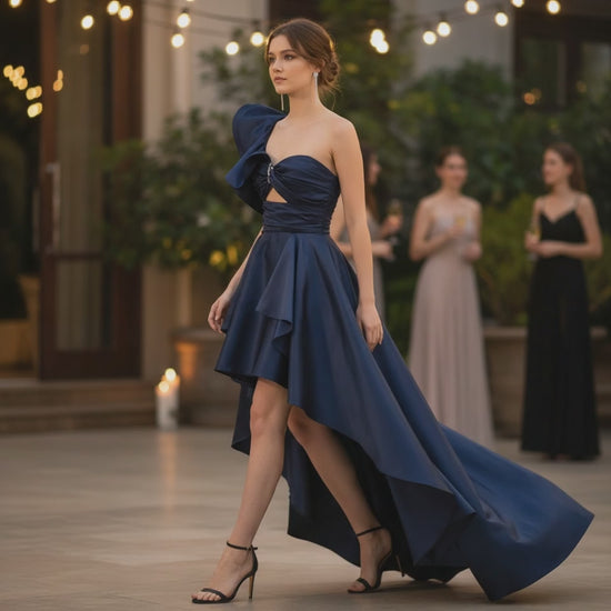L'abito LILITH è realizzato in taffettà e ha una doppia funzione: la gonna lunga con coda è rimovibile per consentire maggiore libertà di movimento durante la festa. Il design elegante del monospalla con rouges lo rende moderno e adatto a ogni occasione. Goditi la tua festa con questo abito versatile e di classe.