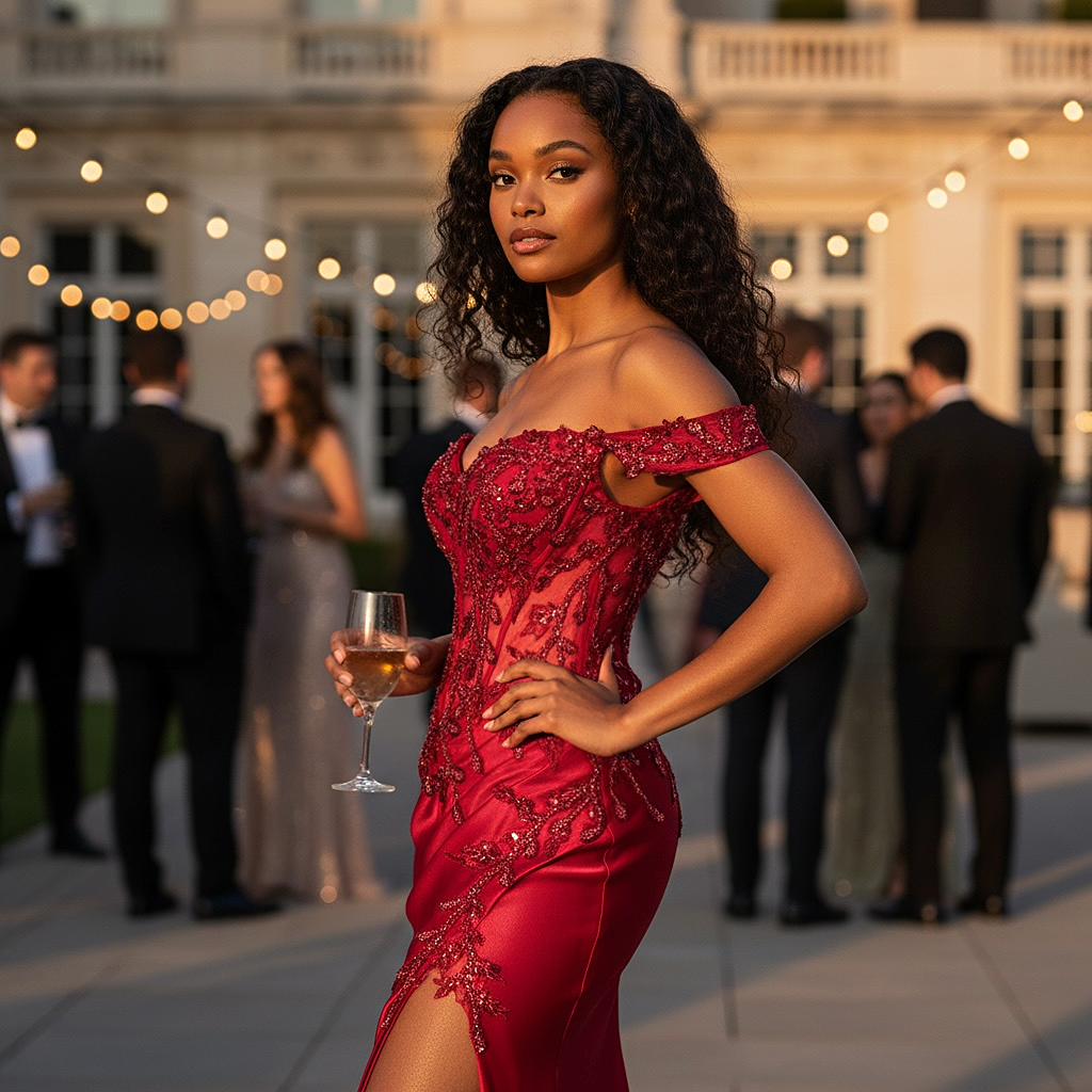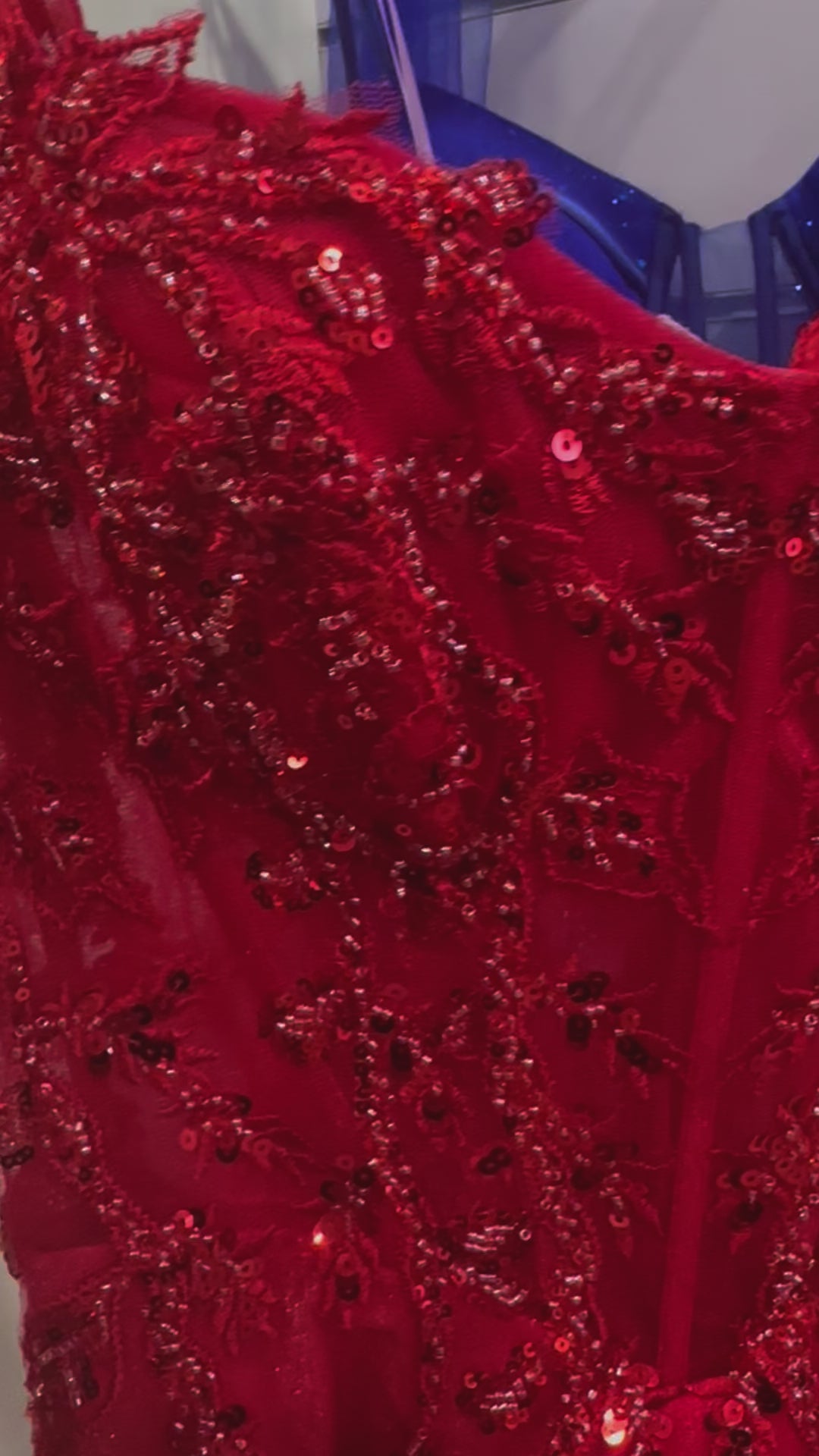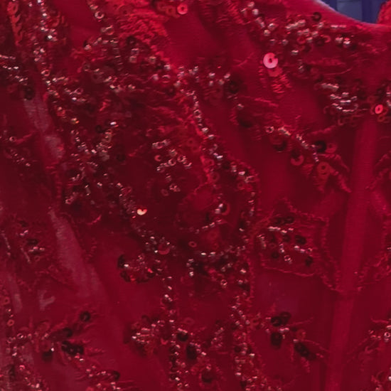 Abito a sirena con corpetto a guêpière steccato interamente adornato con ricami e paillettes. La gonna è aperta a lato con uno spacco vertiginoso e ha la coda.