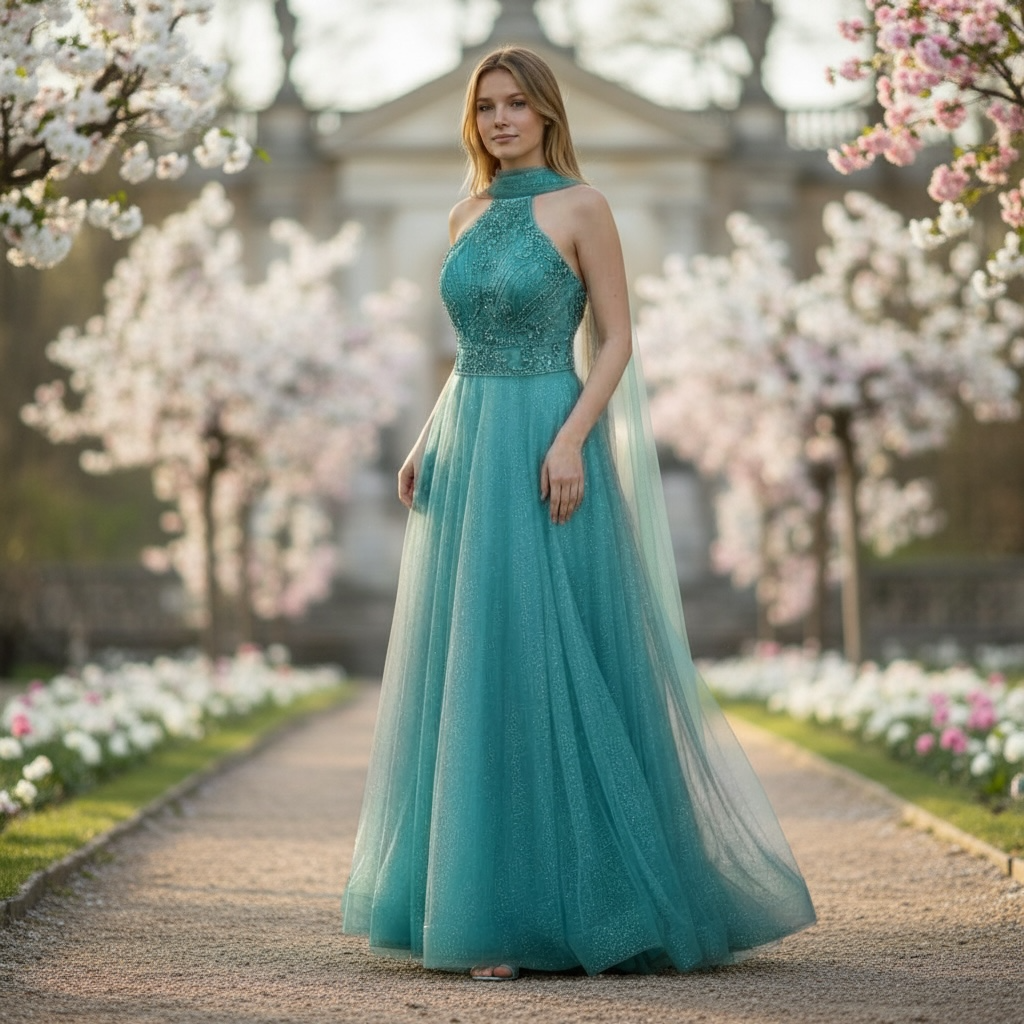 Abito in tulle glitterato con gonna ampia. Il corpino strutturato con scollo all’americana è interamente ricamato a mano. Vestibilità ottima data dal ricamo a cinta che sottolinea e snellisce il punto vita.