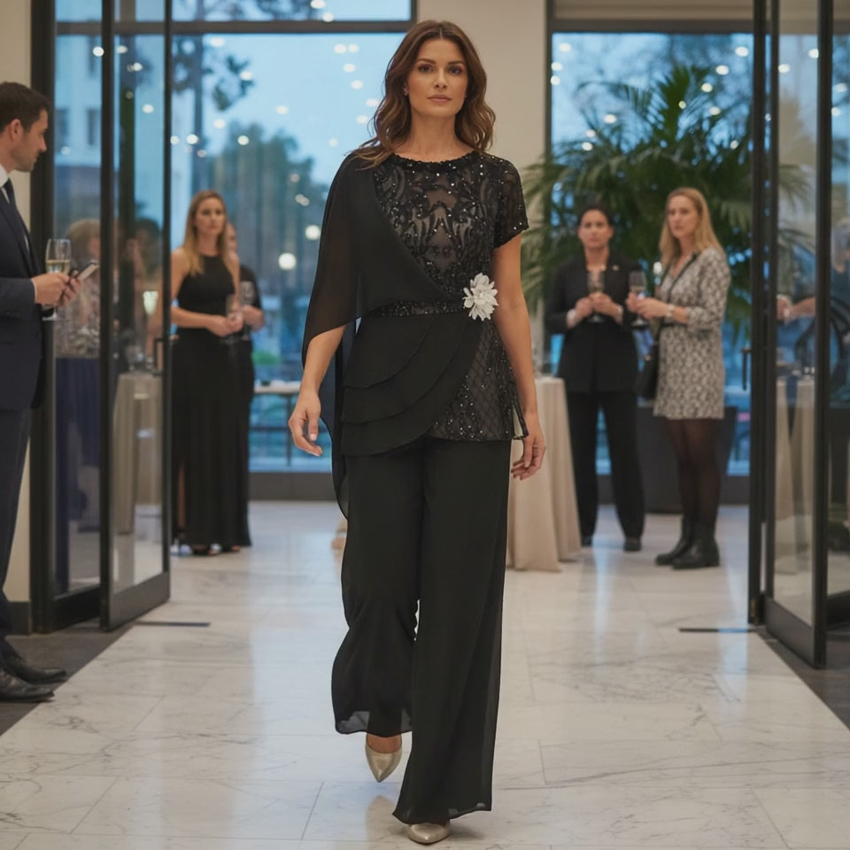 Il Completo GIGLIOLA è composto da un pantalone palazzo in chiffon leggero e un corpino strutturato in paillettes a contrasto con il sotto bianco. Il corpino è arricchito da drappi e manica in chiffon per un look elegante e sofisticato. Ideale per qualsiasi evento, questo completo unico ti farà risplendere.