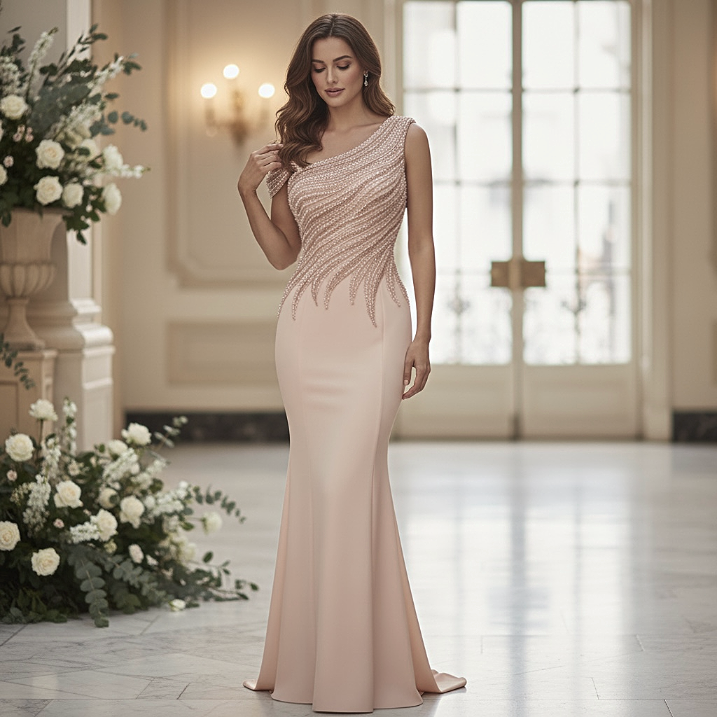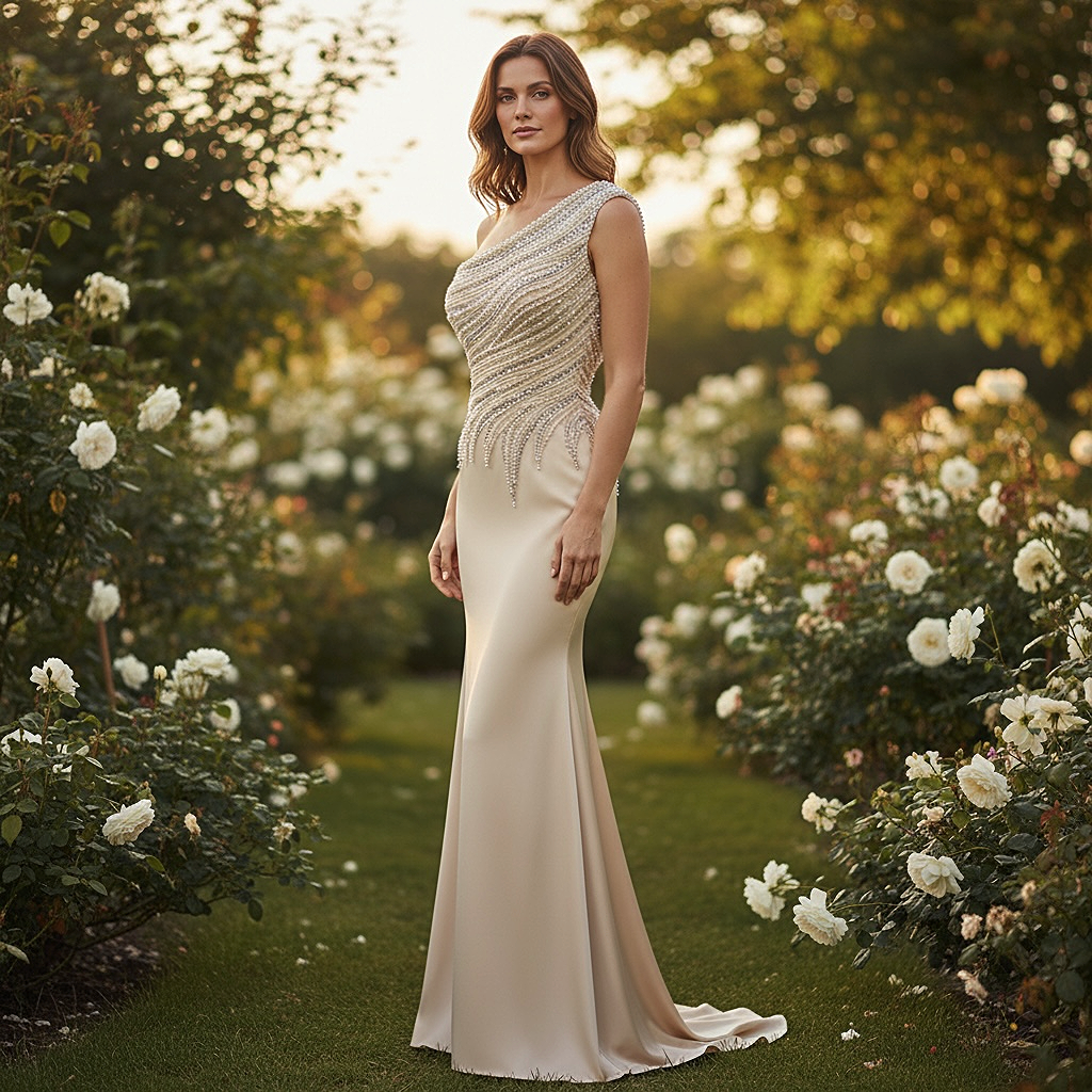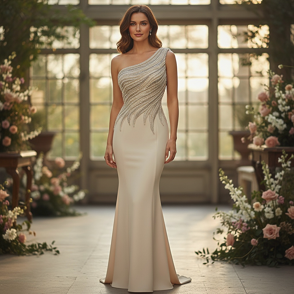 Abito ANTEA a sirena in tessuto strutturato e modellante con corpino monospalla ricamato a mano con perle e strass. Perfetto per chi vuole un abito da sposa unico e prezioso, con una vestibilità ottima che slancia la figura. Ideale per un look elegante e distinto in occasioni speciali.