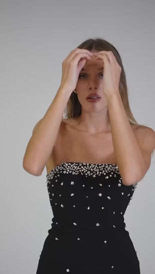 "L'Abito corto AMY è versatile e perfetto per ogni occasione. Realizzato in cady di alta qualità, è impreziosito dalle pietre argento ricamate. Indossalo con tacchi o stivali per una serata elegante o una cerimonia. È versatile ed elegante, il capo giusto per ogni evento."