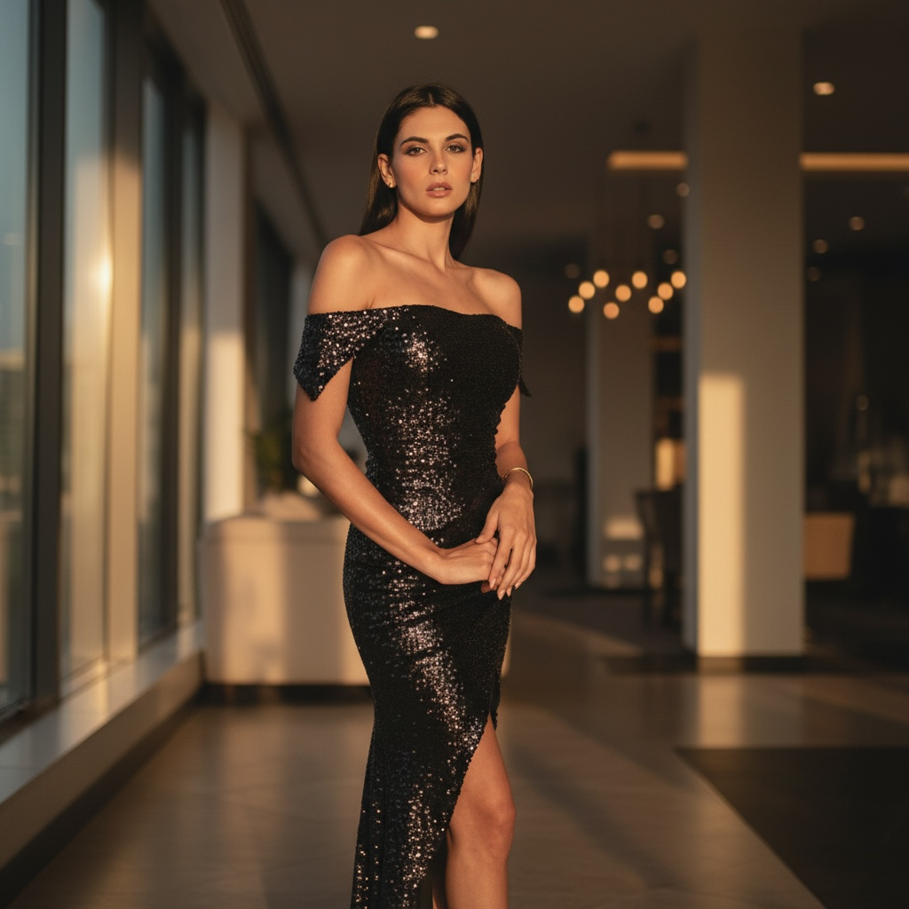 Abito a sirena in paillettes elasticizzato con maxi spacco. Chiusura sul retro e coppetta interna